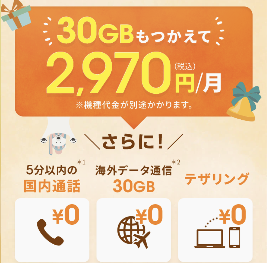 - 月額2,970円(税込)で30GBのデータ通信
